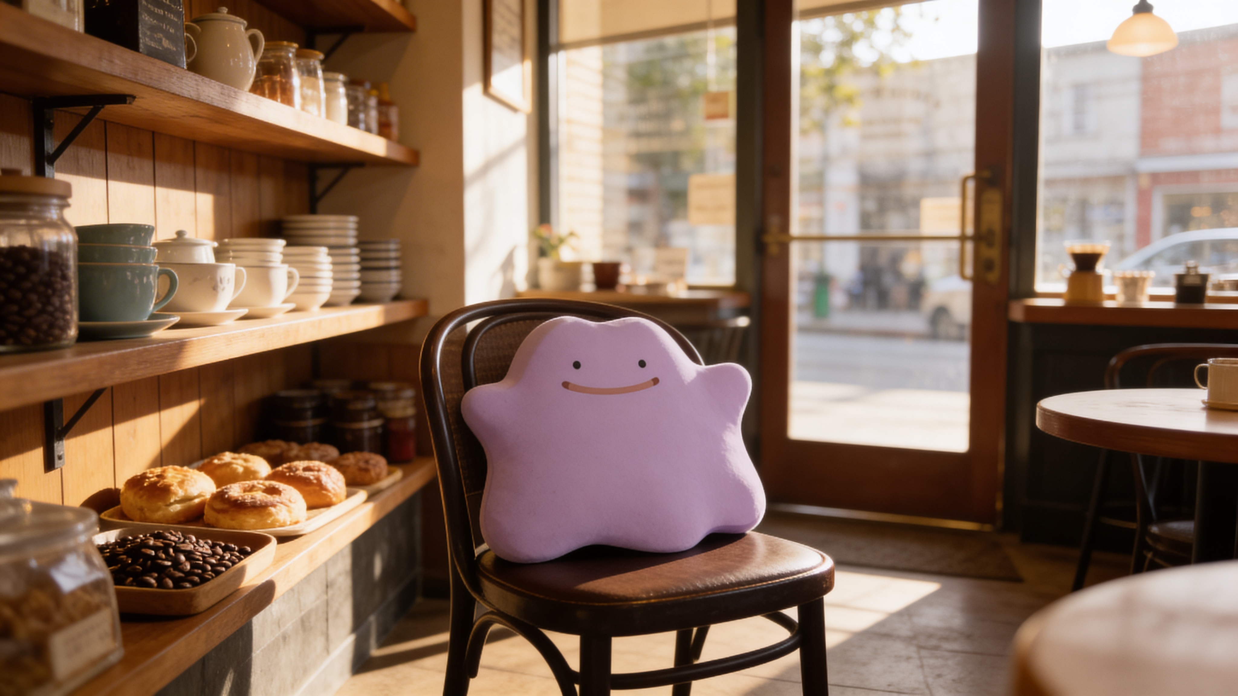 Fan art of Ditto relaxing at a cozy bakery-style coffee shop.